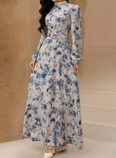 Arabian-Style Floral Dress with High Neck Puff Sleeves and Butterfly Waist