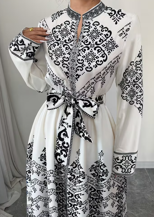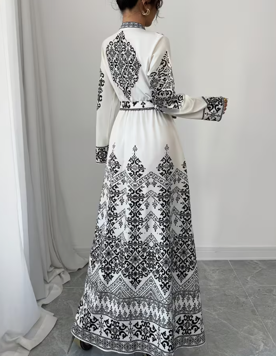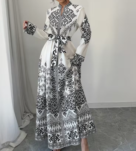 elegant long sleeve dress for women with a paisley print, featuring a half open collarLong-Sleeve Dress with a Paisley Print, Featuring a Half-Open Collar